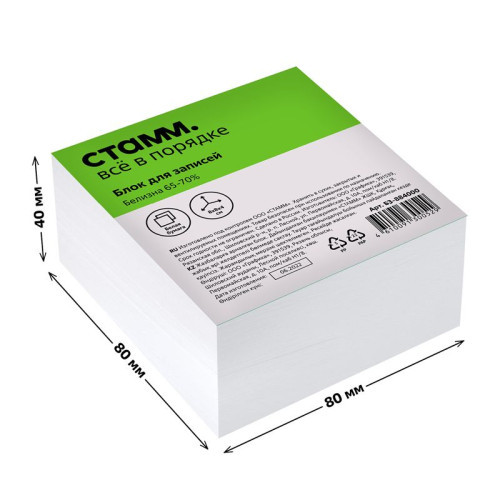 Блок белой бумаги для записей СТАММ поможет вести оперативные записи необходимой информации. Размер листа: 80*80 мм, высота блока – 40 мм. Белизна 65-70%. Подходит для использовагия в пластиковых подставках и настольных органайзерах. Блок представлен в индивидуальной упаковке из термоусадочной плёнке.