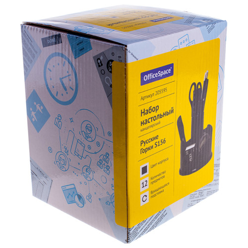 В состав настольного органайзера входят 12 предметов: 2 карандаша, шариковая ручка, степлер, точилка, кнопки, ножницы, канцелярский нож, линейка, скрепки, ластик, скобы для степлера